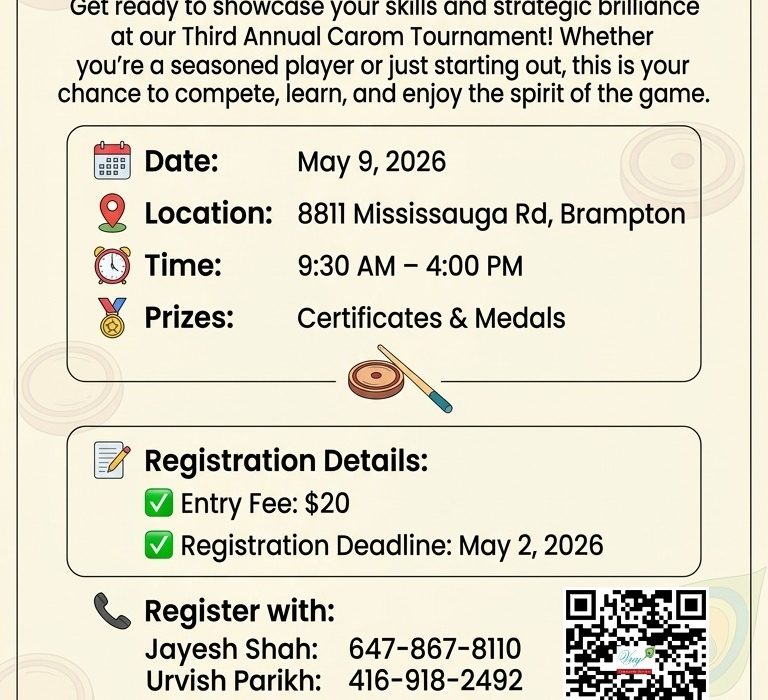 May 9, 2026 9:30 am – 4:00 pm 8811 Mississauga Rd, Brampton Dear Carom Enthuasists, Get Ready to showcase your skills and strategic brilliance at our Third Annual Carom Tournament! Whether you’re a seasoned player or just starting out, this is your chance to compete, learn, and enjoy the spirit of [...]